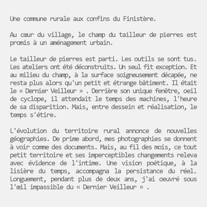 2021 / 2023 - 165 photographies - La lente attente du Dernier Veilleur a pris fin le 14 juin 2023. La série se poursuit en 2024 par "le temps des murets".